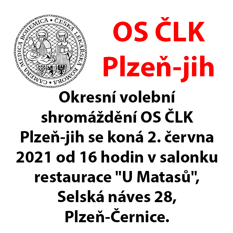 Okresní volební shromáždění OS ČLK Plzeň-jih se koná 2. června 2021 od 16 hodin v salonku restaurace "U Matasů", Selská náves 28, Plzeň-Černice.