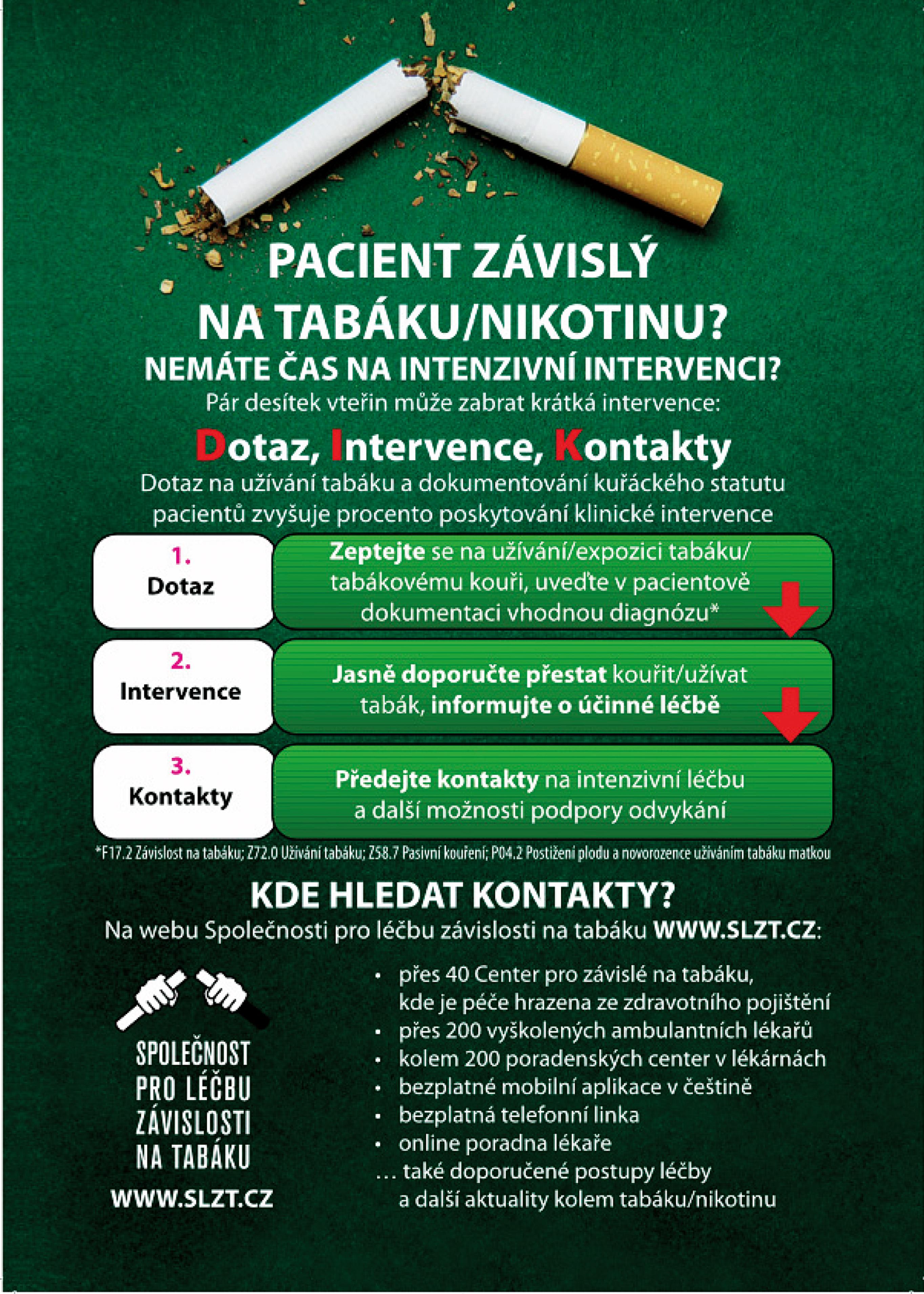 Kouření, tedy především dehtové látky vznikající při spalování, způsobuje onemocnění v rámci všech klinických oborů medicíny. To je také důvod, proč by se touto závislostí měli zabývat všichni zdravotničtí pracovníci, a to nejen lékaři všech klinických oborů, ale i sestry, lékárníci a zkrátka všichni, kdo se setkávají ve své praxi s pacienty. Aplikaci alespoň krátké formy intervence (viz obr.) dokonce ukládá zákon 65/2017.