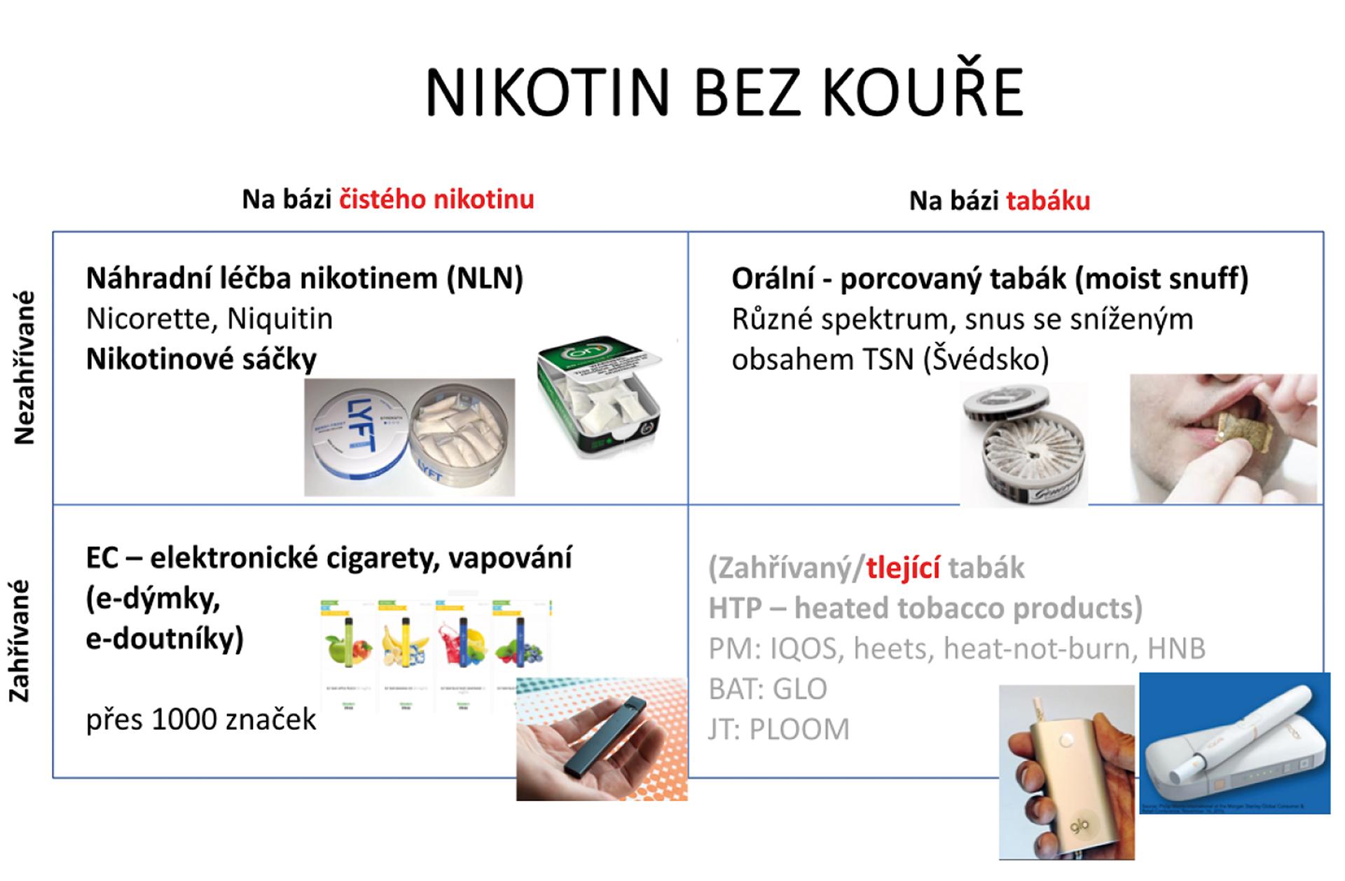 Nikotin bez kouře můžeme kategorizovat jako ty na bázi čistého nikotinu nebo na bázi tabáku, a to buď nezahřívané, nebo zahřívané. Z toho plyne i míra zdravotního rizika – nejméně rizikový je nezahřívaný nikotin (náhradní terapie nikotinem, nikotinové sáčky), následuje nikotin zahřívaný (elektronické cigarety), pak nezahřívaný tabák (orální či porcovaný, u nás snus) a riziku kouření je nejblíže tabák zahřívaný.