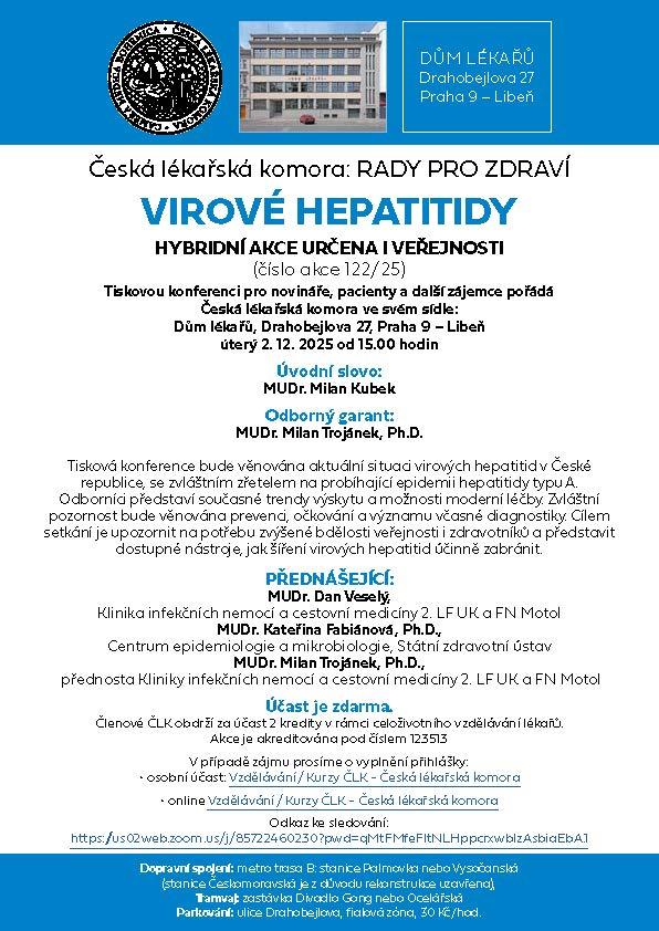 Tisková konference bude věnována aktuální situaci virových hepatitid v České republice, se zvláštním zřetelem na probíhající epidemii hepatitidy typu A. Odborníci představí současné trendy výskytu a možnosti moderní léčby. Zvláštní pozornost bude věnována prevenci, očkování a významu včasné diagnostiky. Cílem setkání je upozornit na potřebu zvýšené bdělosti veřejnosti i zdravotníků a představit dostupné nástroje, jak šíření virových hepatitid účinně zabránit.