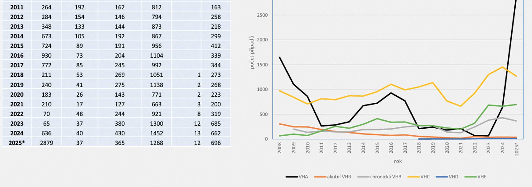 V tabulce 2 můžete vidět vývoj hepatitidy A, akutní hepatitidy B, chronické hepatitidy B, hepatitidy C, D a E od roku 2008 do konce listopadu roku 2025.