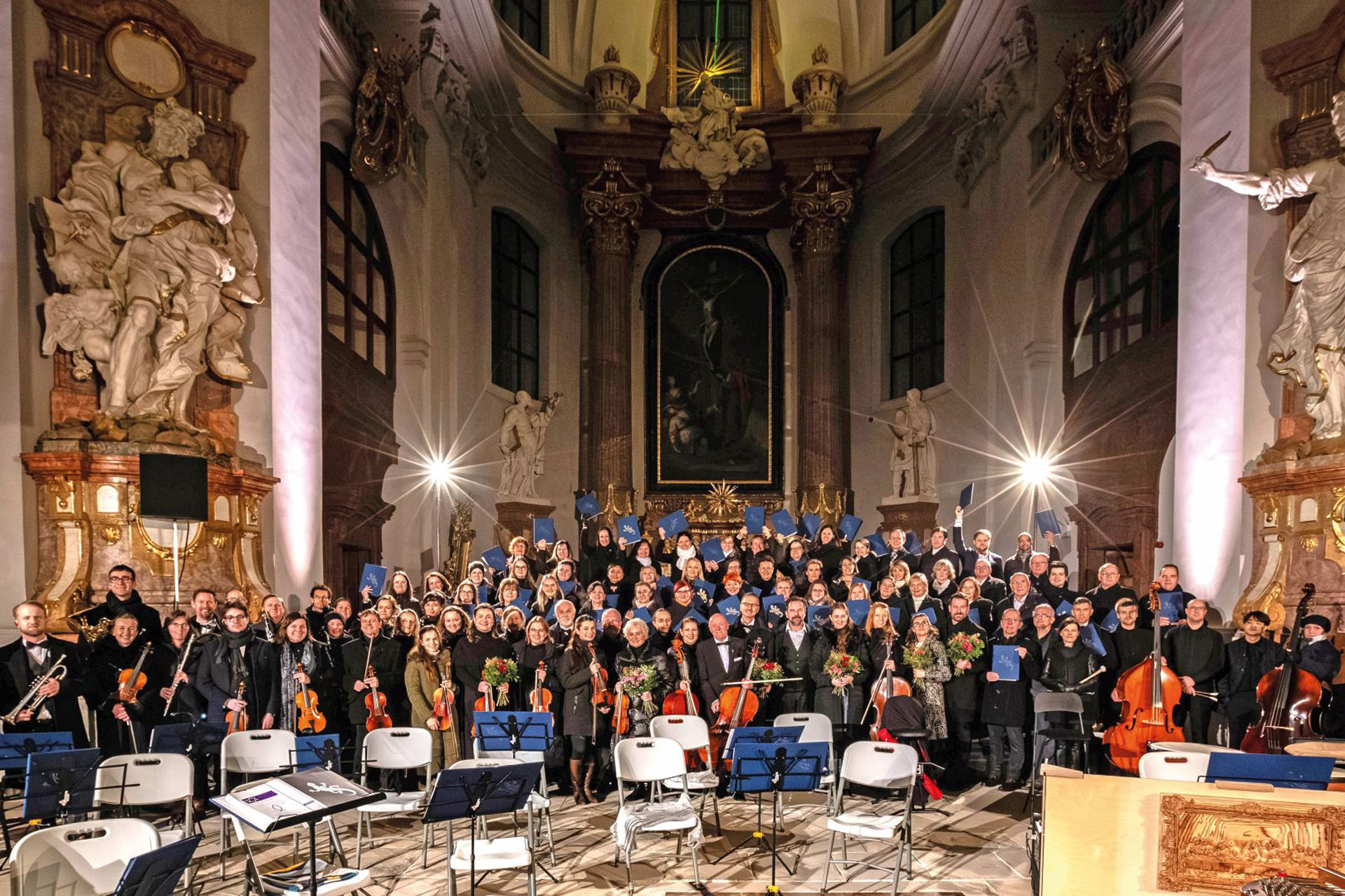 Vše vyvrcholilo slavnostním benefičním koncertem na první adventní neděli 30. 11. 2025 ve prospěch místní Farní charity Litomyšl v naplněném Piaristickém chrámu. Koncert zahájila ředitelka Farní charity Litomyšl Bc. Věra Dvořáková, která představila záslužnou a nenahraditelnou práci této organizace pro širokou komunitu Litomyšle a okolí. Pak dostala prostor klasika, krásná Rybova Mše vánoční. Již od prvních tónů bylo zřejmé, že její provedení bude jiné než obvykle. Snad nikdy jsem neslyšel tuto skladbu zpívanou a hranou tak radostně, spontánně, beze stresu a obavy z chyb. Velkolepý prostor Piaristického chrámu dodal koncertu barokní monumentálnost, cimbálový doprovod vynikajícího cimbalisty Jiřího Gužíka naopak lidovost, vánoční zvonivost a hravost. Sbor i orchestr si užívaly večer do posledního taktu a nechaly mráz pobíhat po zádech publika sem a tam. Zdravotníci pod vedením fantastického, životem a hudbou překypujícího dirigenta Ondřeje Tajovského ukázali, že hrát a zpívat zkrátka umějí a že pomáhat a podporovat obětavou práci charity má smysl. Hudební přídavek ve formě skladby místní scholy „Betléme“, upravené pro orchestr a sbor speciálně pro litomyšlské publikum, povznesl všechny přítomné do výšin Piaristického chrámu. Se zatajeným dechem nezbývalo než žasnout nad dokonalou souhrou prostoru, hudby a síly okamžiku. Toto víkendové zdravotně-hudební přepadení adventní Litomyšle si budou místní i aktivní účastníci dlouho pamatovat. Pro Farní charitu Litomyšl bylo vybráno 54 528 korun a akce byla personálem charity velmi oceněna.